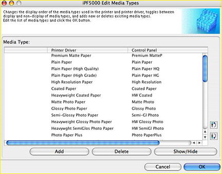 There isa spanner in the works, as the saying goes, and that’s the whole issue of printer settings, both from the unit’s front panel and its driver software. The essence of the problem is as follows. The iPF 5000 wants to know what size paper is loaded, in each possible feed, and what its characteristics are. For example, it needs to know if it’s a matte or glossy paper so that it can choose to use the photo black or matte black cartridge, as appropriate. It also needs to know where the paper is coming from; the roll holder, the top feed, the front feed, or the cassette.