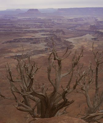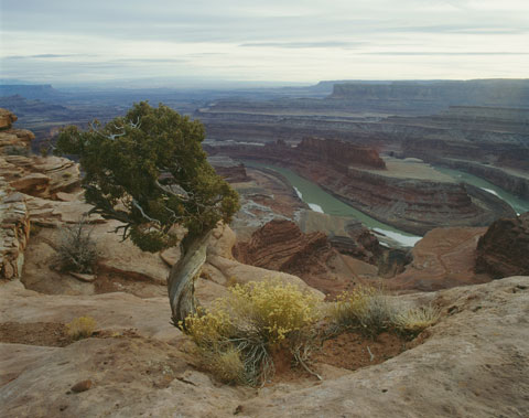 The sweep of the Colorado River as it runs through Dead Horse State Park is difficult to capture in a photograph. Rather than to try and do so with a panoramic shot I found this tree whose shape mirrors the gooseneck a thousand feet below. The soft light of a late winter day muted the high contrast normally found in this location, though I did have to crank up the contrast and colour saturation a bit — it was too soft.