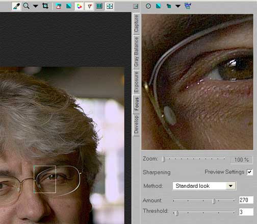TheFocustab (Fig 3) performs two functions; it serves as a magnifying area, and secondly provides USM tools. My preference is to leave these at "0" because I feel that sharpening should be done after everything else and just before printing, with the amount of sharpening based in the final print size. But, this software is designed so that you can produce images that are essentially "finished", even without going into Photoshop, and so USM is one of the tools provided.