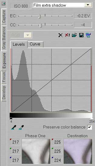 TheExposuretab provides both Levels and Curves adjustments as well as an Exposure slider (EC) and a Contrast slider (CC). Again, this can be done either in composite RGB or for each individual colour channel.
