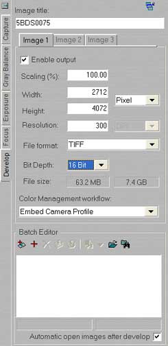 TheCapturetab (not shown) is used primarily when the camera is used in tethered mode, but it does display a histogram. In Fig. 5 we see the Develop tab which controls how files are converted. The items you see are pretty much self explanatory. At the very bottom you’ll see that you can set the program to automatically open your favourite image process software, such as Photoshop, once the file has been saved and to automatically load the file.