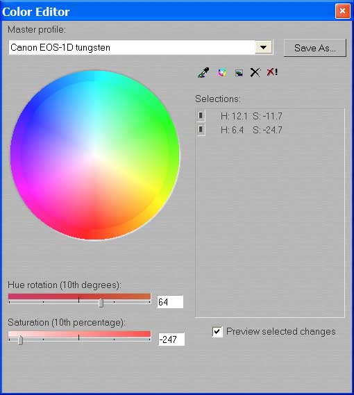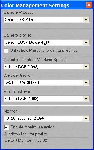 As mentioned above,Capture Oneis provided with several generic profiles for both the 1D and 1Ds. These include Daylight, Flash, Tungsten, etc. These are provided as part of the program’s comprehensive approach to Colour Management. Uniquely, Capture One also provides a utility that allows you to edit these profiles; to fine tune them to your particular needs. Note that this is not a general purpose profile editor and that it only works withPhase One‘s provided profiles.