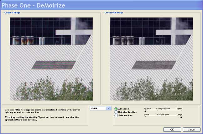 When you installCapture Oneyou have the option of also installing a Photoshop plug-in that removes Moire patterns. I have only used this for a short time, so won’t comment in detail, but it seems to do an "OK" job. My concern is that on several occasions it crashed Photoshop. But, I had a number of other applications open at the same time and so may have simply run into a memory allocation problem. The plug-in does appear to change the colour of certain objects so it needs to be used with care.