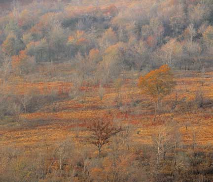 In this photograph, taken along the Blue Ridge Parkway just before sunset on a day in late Autumn, we have everything from the dark Red tree in the foreground to the Yellow one center-right, accentuating the Oranges which add so much warmth to this image.