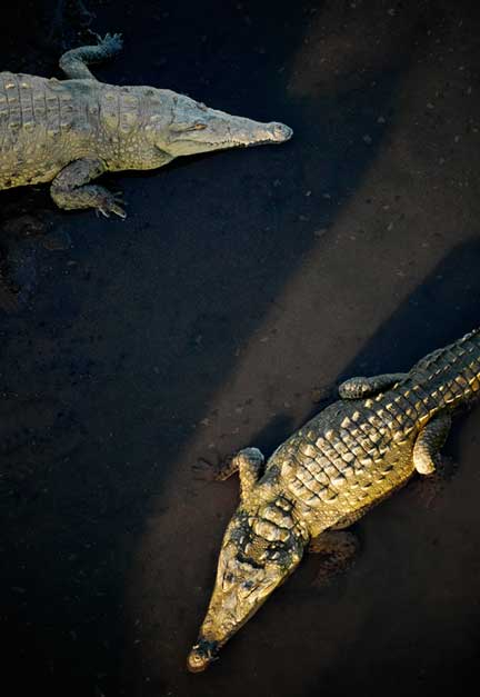 I shot about 50 frames as the light changed. This one appeals because of the strong shadows on the lower croc and the almost humorous yet menacing expression of his friend in the shadows.