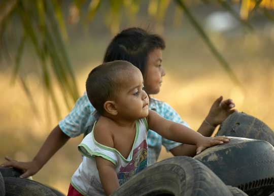 I was first drawn by the warm tropical light behind them, but then I saw that the forms and lines created by their arms, the palm fronds and the tires created a strong composition. In this frame the intensity of the children’s gaze completes the gestalt.