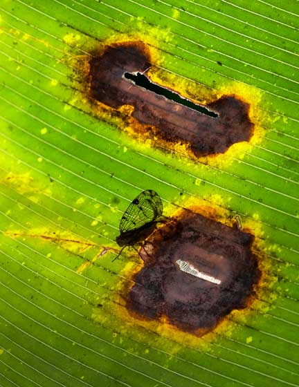 One day we went on one of our numerous forest hikes and I decided that rather that pursue birds and monkeys in the canopy I would seek out the very small with my macro photography gear. My eye was caught by a very large fern above my head that was brilliantly backlight. As I looked more closely I saw the patterns created by this mould, and then as I was starting to frame the shot the transilluminated insect wings .