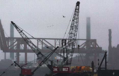 The drive to Niagara from Toronto takes one past the steel-making city of Hamilton, a gritty place made all the more so that day by the dense fog and driving rain. Out of curiosity, as well as a desire to get off the expressway because of the nasty weather, we drove down to the city’s industrial harbour.
