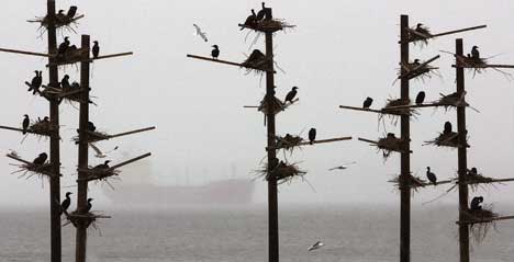 This bizarre stand of clearly artificial roosts sits at the edge of an industrial harbour.