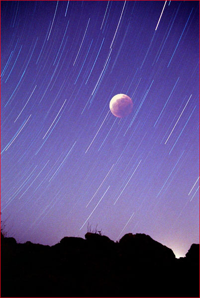 Star trails passing in front of the moon were cloned out of this full frame image. Sharpening and incrasing contrast were the only other image enhancements.