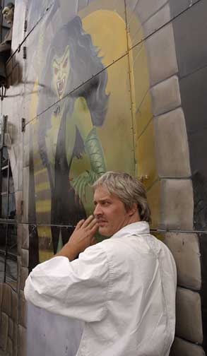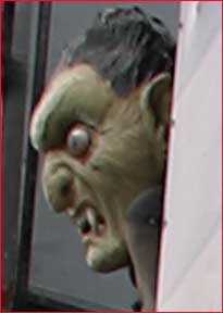 This fun-house wall and its female vampire illustration caught my attention. There was a man standing beside it, not looking in any way special, but I walked closer, and as I did he turned toward me. I took this frame because I saw an interesting juxtaposition between the gargoyle in the upper left of the frame, the illustration’s face, and the man’s expression and body language.