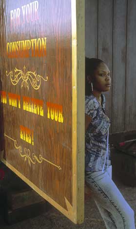 Irony sometimes takes the form of unintentional humour. The juxtaposition of this attractive young woman and sign is funny. (This is the same building as theDiablo Carnival of Wondersseen higher on this page.) A candid portrait like this would be interesting by itself, but part of the intrigue here lies in the fact that she was unaware of the irony associated with where she was standing.