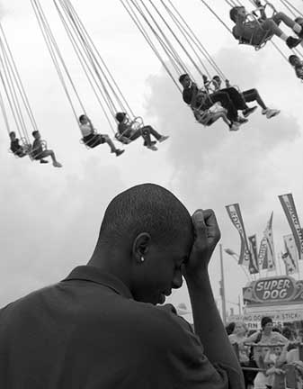 This image definitely wanted to be in B&W. If running a Midway ride for 12 hours a day isn’tExcedrin Headache #12, I don’t know what is. The shiny earring draws ones eye because it floats in a large area of dark skin and a dark shirt. Theflyersoverhead seem to part of this young man’s bad day, and the people waiting in line complete the gestalt. Maybe there isn’t an enigma in this frame after all. Just a headache.