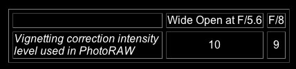 Vignetting: Moderate vignetting, no more than the slight amount seen in pictures from very good lenses on film SLRs. Correcting the small amount of vignetting from this lens for pictures made at F/4 or smaller apertures isn’t necessary at all.