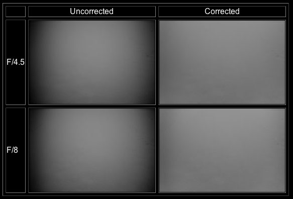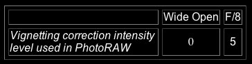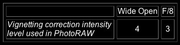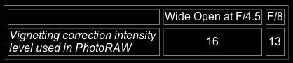 Vignetting:Vignetting was tested at all major apertures at a focus distance of ten feet. Vignetting corrections were then made using the vignetting correction tool in Epson’s PhotoRAW program (discussed in Part One of this review) which has a variable intensity setting that uses a scale of –20 to +20.It’s important to note that the number zero is a middle setting on that scale, not an indication of zero correction.Sliding the level to the right of zero lightens the corners of the picture: sliding it to the left lightens the center of the picture. The stronger the vignetting, the greater the intensity setting one needs to use in order to correct it. In the lens tests below, I’ve noted the intensity setting used to correct vignetting on each lens at its maximum aperture and at F/8.