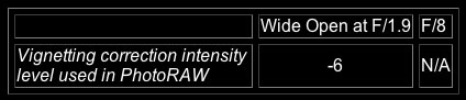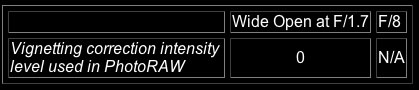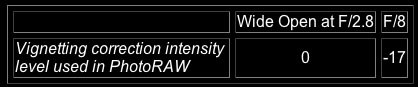Vignetting:Moderate vignetting, no more than the slight amount seen in pictures from very good lenses on film SLRs. Correcting the small amount of vignetting from this lens for pictures made at F/2.8 or smaller apertures isn’t necessary at all.