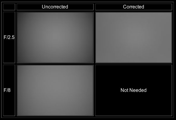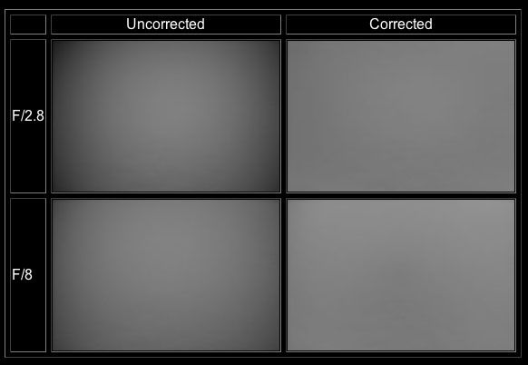 Vignetting:Moderate vignetting, no more than the slight amount seen in pictures from very good lenses on film SLRs. Correcting the small amount of vignetting from this lens for pictures made at F/2.8 or smaller isn’t necessary at all.