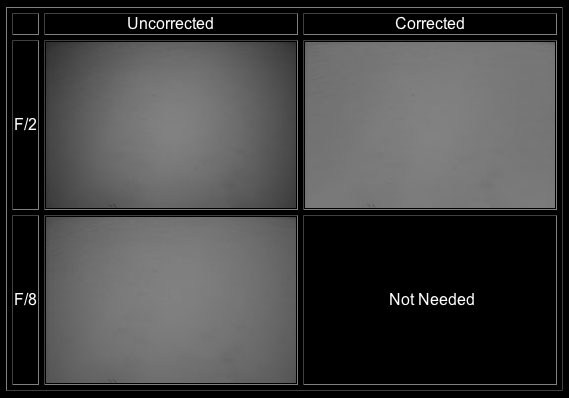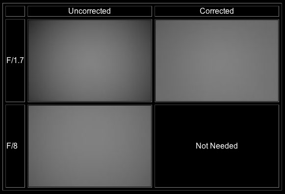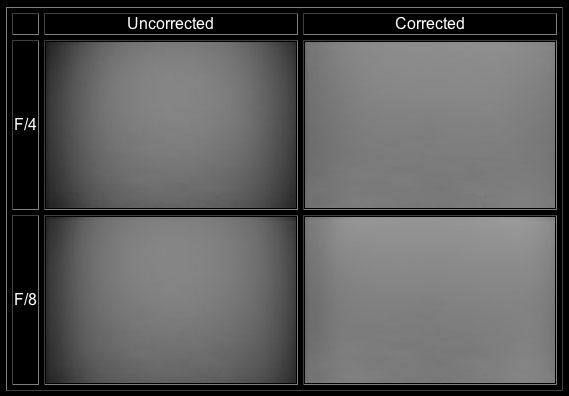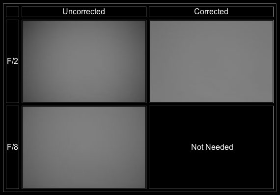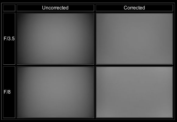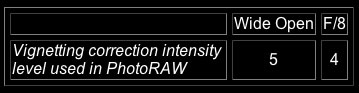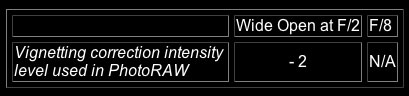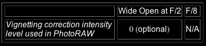 Vignetting:The lens shows very minimal vignetting, no more than the slight amount seen in pictures from very good lenses on film SLRs. Correcting the small amount of vignetting from this lens (even when used wide open) is certainly not necessary.