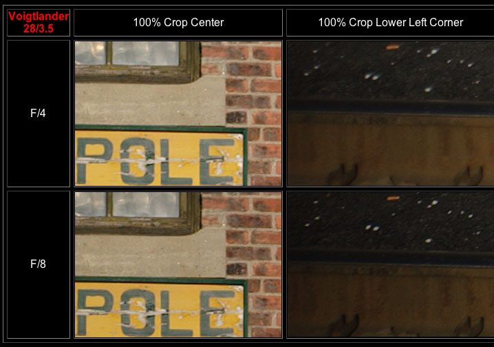 Vignetting:In the snowy field test pictures, vignetting is significant even when this lens is stopped down. With more common and less uniform subjects the vignetting is less noticeable but still quite obvious. To use this lens on the R-D1, a photographer would need to either accept moderate vignetting as part of the look of the picture or manually remove it in PhotoRAW, especially with pictures made at larger apertures. The vignetting from this lens is noticeable enough, with common subjects, that many photographers will likely want to correct it. The lens vignettes more strongly than the 12/5.6.