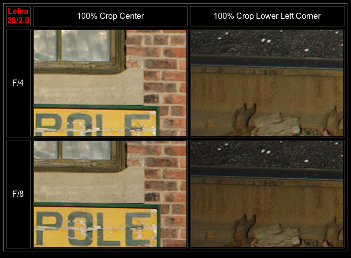 Vignetting:The lens shows very minimal vignetting, no more than the slight amount seen in pictures from very good lenses on film SLRs. Correcting the small amount of vignetting from this lens (at F/2.8 and smaller apertures) is certainly not necessary. Note: The Leica 28mm lens arrived a week later than the other lenses and so had to be tested separately for vignetting. I used a different snowy field but the same overcast lighting conditions. The slight blotches seen in the vignetting samples for this lens are simply characteristics of the subject.