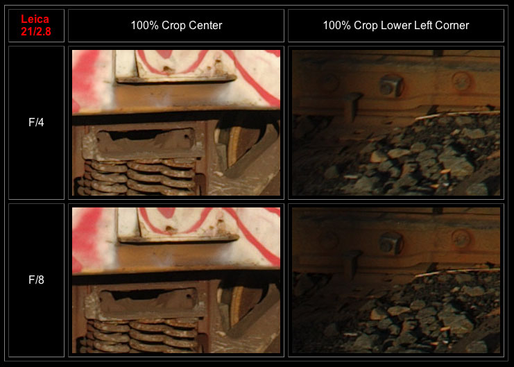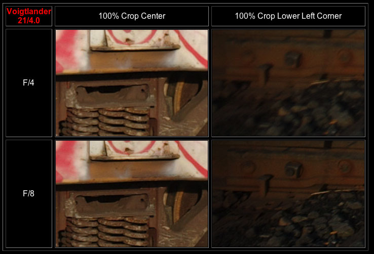 Vignetting:Some vignetting wide open but this lessens significantly by F/5.6 and is minimal from then on. Very good vignetting performance overall for a 21mm lens on the R-D1. Many photographers will not likely not feel the need to correct the small amount of vignetting from this lens for pictures made at F/5.6 and smaller apertures.