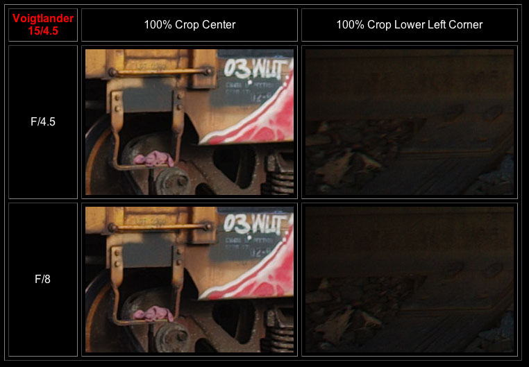 15mm:TheVoigtlander 15/4.5is also a very good lens overall. On center, it’s sharper than the12/5.6but as one looks further and further out towards the edges of a file, the15/4.5becomes softer and moves towards vignetting. The12/5.6, on the other hand, starts out a little softer at the center but holds its focus and tone better into the edges and corners. Vignetting is stronger and more noticeable on the15/4.5. Color rendering is good, saturation and contrast are a little higher than the12/5.6. Resolution seems quite good for the central portion of the frame. Distortion is also well controlled considering what a wide lens this is.