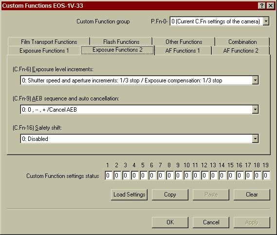 Some people areCustom Functionnuts. I’m not one of them and so I won’t go into anywhere near as much detail as you might like. Sorry. Let it be said though that every custom function that the EOS-1V is capable of can be set from this software‚ a much easier job than doing it at the camera with a cheat-sheet in hand. As you can see above the tabbed screens and drop-down menus make selecting your preferred combination a snap. Uploading them to the camera only takes a few seconds.