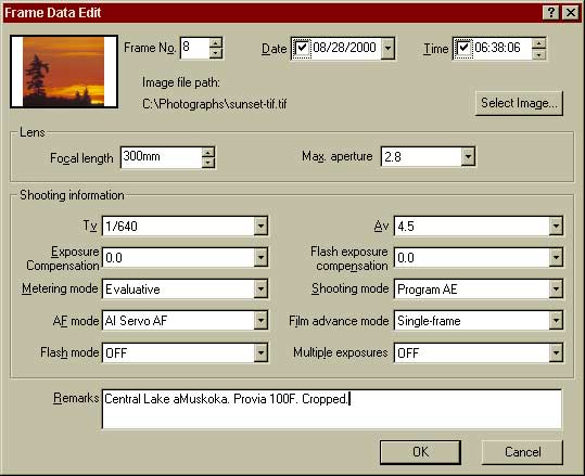 At this point you’re probably wondering how the thumbnail got there. Simple. Any scanned image can be easily loaded as a thumbnail. No need obviously to scan the whole roll. Just the ones that you are most interested in and working with. If for some reason you wanted each and every roll to have complete thumbnails then the simplest way would be to have aPhoto-CDscan made at the time of processing‚ the least expensive way. Loading the picture is simply a matter of clicking on theSelect Image..button as seen above and pointing to a TIFFfile. (It should loadJPGfiles as well, but my copy of the software refused to.)