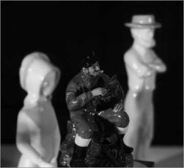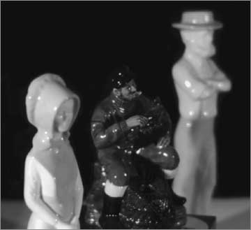 To close this discussion, I offer two last photographs. They are of the same three china figures seen in Figure 2. The 180/5.6 Nikkor-W was used to produce Figure 10, while the 250 Imagon was used to take Figure 11. The overall soft image of the lobster fisherman is evident in Figure 11, but the highlights on the woman in the foreground display a very definite bright ring effect and are quite annoying. By way of contrast, the Nikkor elicited very soft highlights in the foreground and a very sharp image of the lobster man. The highlights on the male figure in the background are similar in these two photographs, although close examination will reveal the slight bright ring effect of the Nikkor, and the bright core effect of the Imagon. Another effect can be seen in the highlight on the woman’s right eye. We see just half a circle in both photographs. What this means is that light from that particular highlight is quite directional, and only the bottom half of the lens was illuminated by it.