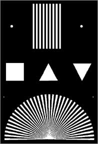| The simple white-on-black test pattern used to determine some of the effects of aperture shape on the out-of-focus images. | Here’s the test target as photographed with an upwards pointing triangular lens opening and with the film too close to the lens. |