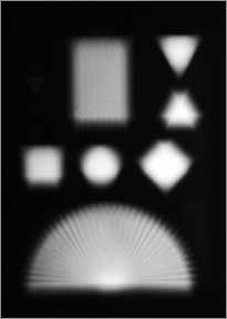 Another principle illustrated by Figure 4 is that any object having edges that line up with the edges of the lens aperture will tend to be resolved to some degree. In Figure 4 we see, for example, that in the fan of lines at the bottom of the figure, horizontal lines and lines at approximately 30 degrees to the vertical are resolved, while lines at other angles are not. So what is the ideal shape for the lens opening? It depends upon the subject! A perfect circle is probably about as neutral as we can get: it shows some degree of spurious resolution for lines at all angles! The circle plays few favorites.
