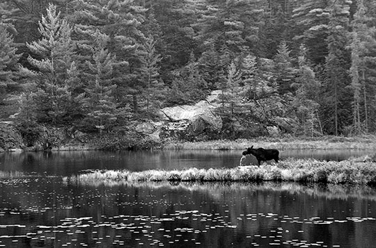 Every spring I try and spend a day or two photographing moose and other wildlife in Algonquin Park in northern Ontario. This year the moose were in profusion, but the weather was dreadful — drizzly, with flat light and low contrast. Also, though we saw and photographed at least twenty moose over two days, for the most part they were standing in the boggy ponds near the roads. This is fine for doing head and shoulder portraits, but that’s not the type of wildlife photography that I enjoy. I would much rather photograph animals in the wild so as to show them in context, in other wordslandscapes with wildlife.