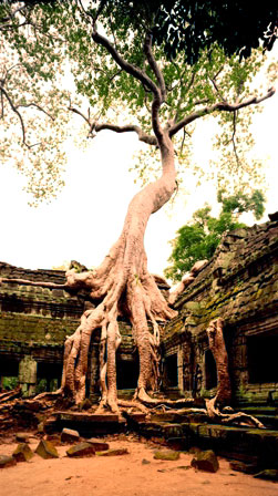 A Fichus growing out of the roof of a temple at Angkor Wat using the cameraturned vertically and the back shifted 15 mm downward. Horseman SW612 pro,55 mm lens, Kodak Portra VC 160.