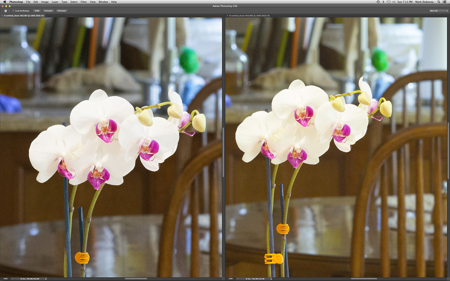 The following is a screen shot of the Leica (right) and the Nikon (left) images side by side at 100% in Photoshop:
