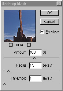 I find that a setting of125 / 1.5 / 1in my scanning software and about the same again in Photoshop does the job nicely, but since this is a matter of both taste and equipment used you’ll need to experiment with what works for you. You can use thePreview buttonto judge the effect. ClickOK.