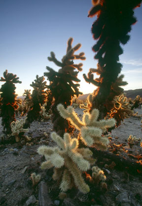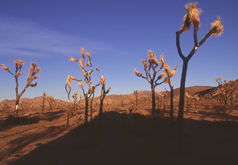 Sometime during 1999 there was a brush fire which burned a large number of Joshua Tree cactuses. What a tragedy considering how many years it takes them to grow. They did create a very stark appearance as the rising sun cast its long shadows and warm light.