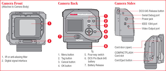 Using the DCS Pro Back is about as simple as it could can be. It attaches to the camera just as does a film back. The rear panel has a minimal number of control buttons, and a colour LCD screen. On the whole the screen menus and their control functions are logically laid out and easy to navigate. Figure 1 below, taken from the Kodak documentation, shows the control layout and interface ports.