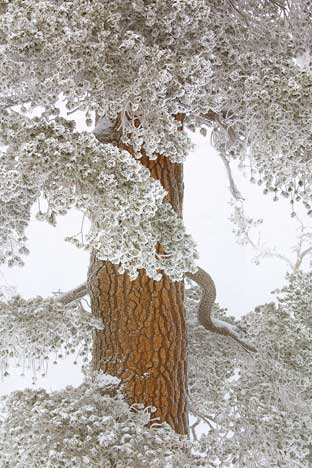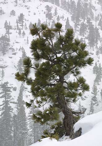 This photograph was taken during a moderate snow flurry. Not enough snow to interfere with the clarity of the tree but just enough to soften the background hillside. The monochromatic contrasts, combined with the dark-green of the pine as the only subtle touch of colour, makes for a strong image.