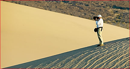 At about 5:30pm on Wednesday evening, about two hours before sunset, we drove out to the sand dune area nearStovepipe Wells. The skies had cleared and even the haze that had lingered all day had blown away. Not a cloud was to be seen, and we knew that we had the weather nailed. Also, the wind storm of the evening before had blown the dunes clear of footprints. Bonus!
