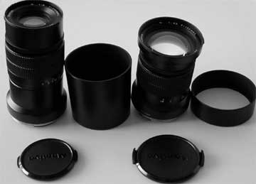 As if to compensate for the poor shade, the 150mm lens is the only one with a well designed lens cap. All other lens caps are poor. The tabs are too small and too short. Unless the user has very long nails or slim fingers the caps usually end up on the ground.
