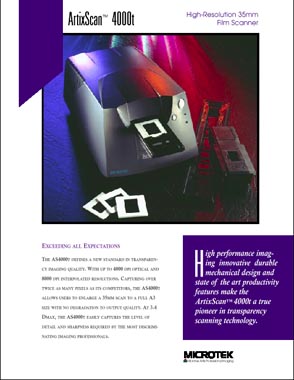 June 30, 1999: One of our readers has just provided me with information on a new high-resolution scanner from Microtek. Called the ArtixScan AS4000t, it joins the Polaroid 4000 as the second scanner on the market with 4000 DPI of optical resolution.