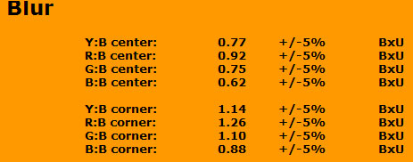 The Minolta scores substantially better than the Sony on the Blur measurement,. At the mid-range 20.5mm focal length center reading is more than 1 BxU better than the Sony.