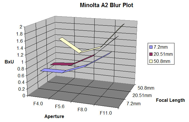 The Minolta appears to offer it’s best resolution performance at the wide end of it’s focal length range with blur increasing at the lens gets longer. But even worst case, with the lens at 50.8mm (200mm equivalent) the Minolta remains 1-2 BxU better than the Sony. Excellent performance.