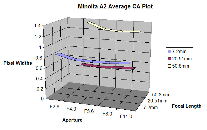 In terms of lateral chromatic aberration the Minolta measures similarly to the Sony at the long and wide ends of its focal range, but whereas CA drops to negligible values in the mid-range with the Sony it remains fairly constant at all focal lengths on the A2.