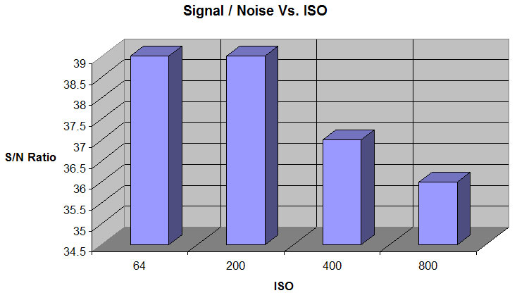 The Signal to noise ratio at ISO 64 of 39 dB places the Minolta just slightly behind the Sony F828 in this measurement. It appears that the blue channel is the culprit.
