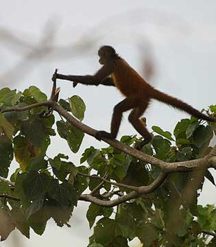 Spider Monkeys were ubiquitous, but rarely venture too close to people. The lodge had a roof observation platform which places one right at tree-top level. I would sometimes spend the late afternoon scanning the trees with binoculars looking for monkeys and one afternoon just before sunset found this fellow leaping from tree to tree.