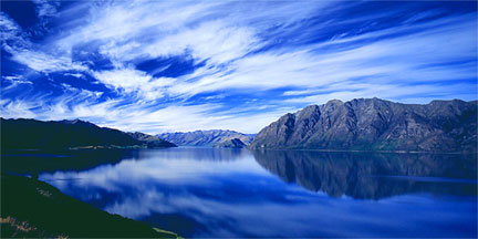 Clouds maketh the image. This was pure good fortune as I was traveling between towns on South Island one day. These amazing high altitude clouds formed and I hurried along looking for a good vantage point over the lake. With the lake being still, even at midday this turned out to be a striking image. The addition of a warm polarizer picked up the contrast and made the sky leap off the lightbox back home.