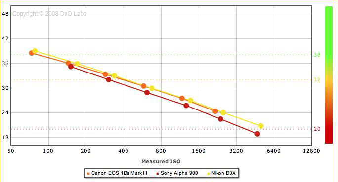 ISO 1600 noise is quite well controlled, subjectively comparable to other cameras in its class, such as the 1Ds MKIII and A900. Below is a comparison of the D3x, 1Ds MKIII and A900 from DxOMark. It shows that even at between ISO 2000 and 3000 the noise difference between these three cameras is less than 3db, which is visible, but below the point where it is significant.