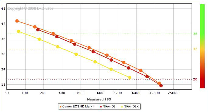 And just for the record, below is a graph from DxOMark showing the D3, D3x and the Canon 5DMKII. The D3x lags the D3, as is to be expected, but the Canon 5D MKII edges out the D3x by a full 6DB, which is significant. Not to diminish the fine performance of the D3x, but it is not the leader of the pack when it comes to low noise at high ISO, even in its resolution class.