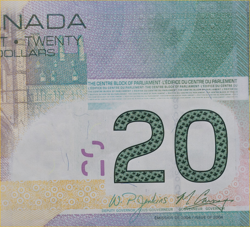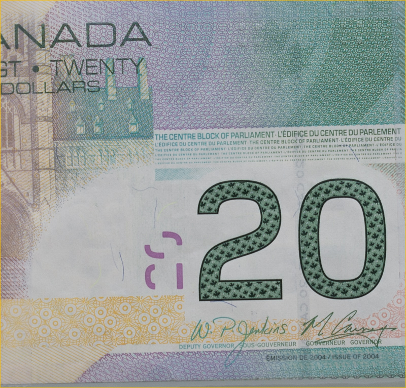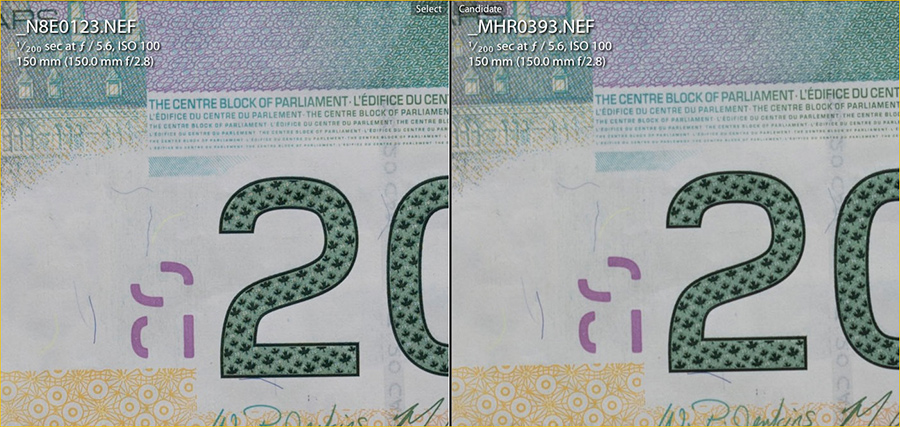 OK, maybe. So, I had some time today to do another series of tests, one of which is displayed below. This is one that anyone can do in their own backyard. I taped a Canadian $20 bill flat to a window glass (Euros, Pounds or US Dollars work equally well), then carefully aligned the camera to be plane parallel. Currency is a good macro subject because of the extreemly fine engraving.